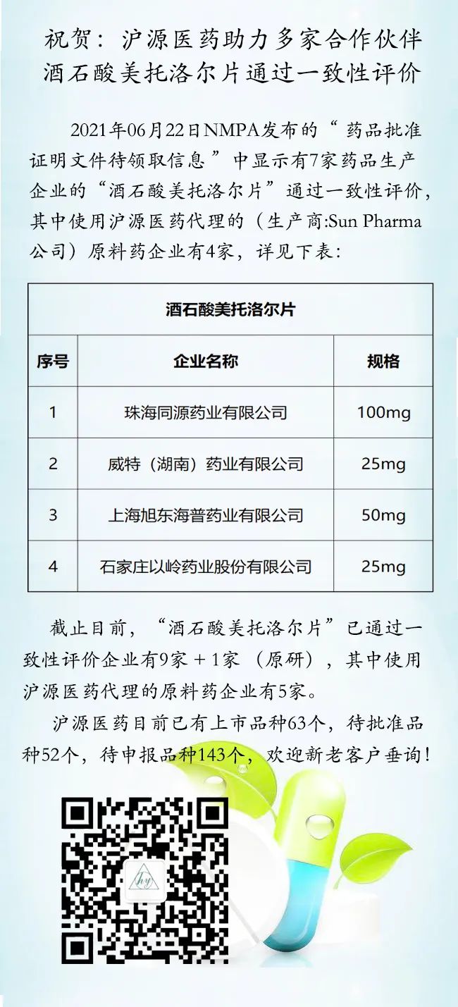 祝贺:沪源医药助力“珠海同源、武汉远大、石家庄以岭、旭东海普、湖南威特”合作伙伴的“酒石酸美托洛尔片”通过一致性评价
